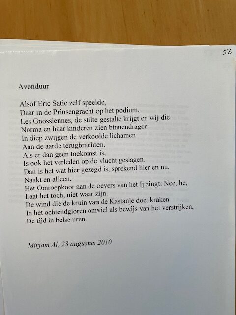 en dan de bijzonderheid van de middag – de man met een zonnebril deed 6 ultra korte gedichten – met tijdopgave – hij noemt zich kazimir ray – ik wil bekend worden zei hij – ik kreeg zijn gedichten mee – 6 viltjes – ik zal hem nooit meer vergeten.