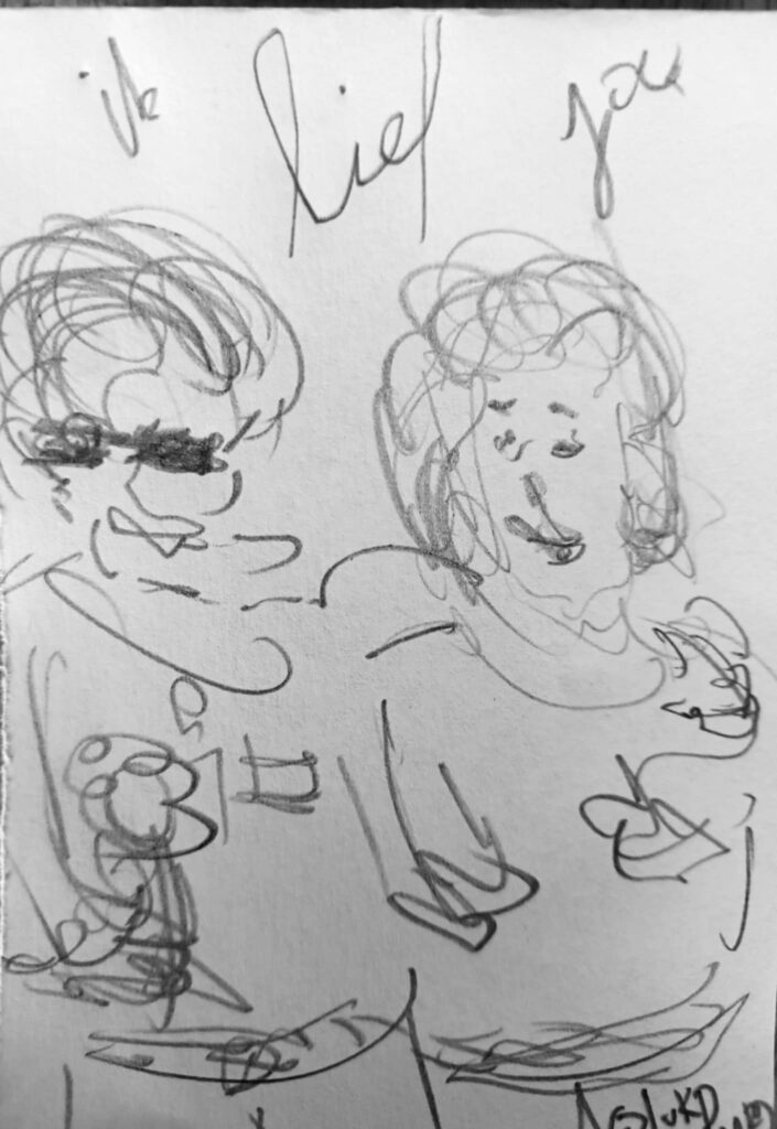 dank aan de inzenders deze week bij de inspirerende woorden van Margo van Gelder. dank ook aan Luk Paard voor de getekende bijdrage ‘IK LIEF JOU’ – hieronder geplaatst – Luk vat het thema prachtig samen. het goud in de wedstrijd die geen wedstrijd is reserveren voor de dichter André Heijnekamp – de imperfecte perfectie van het menszijn goed getroffen… schreef ik in het commentaar – ik an het niet beter zeggen – van harte André!