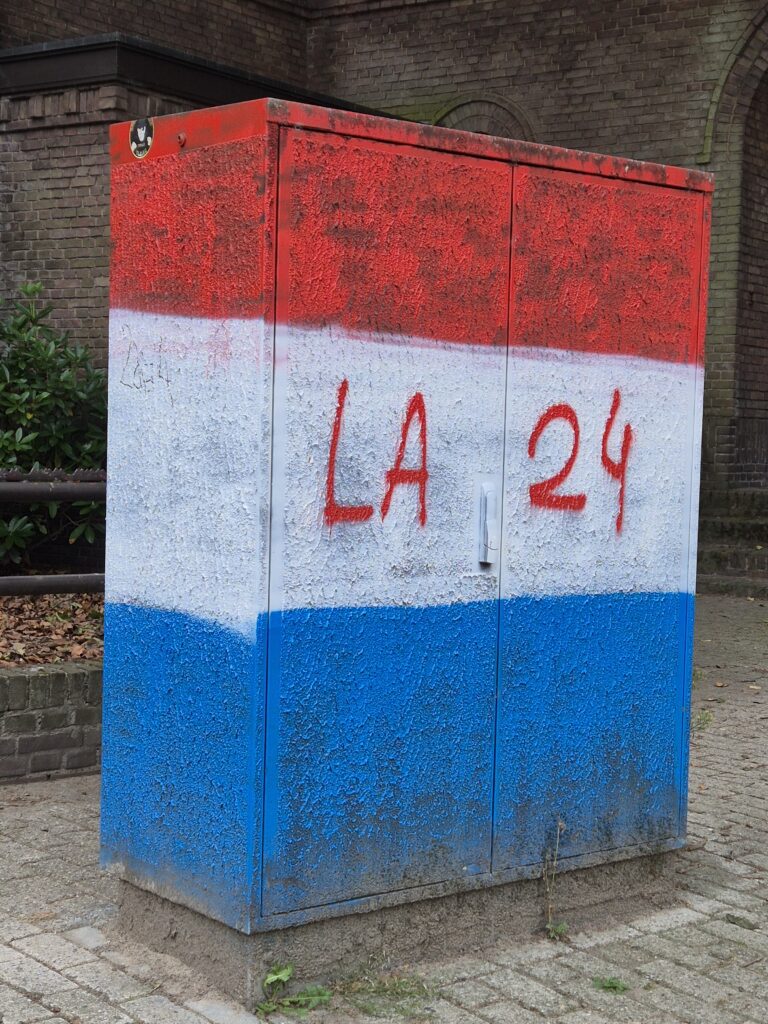 Ach … hoe kom ik hierbij … de kaping van ons rood, wit en blauw? Met de verkiezingen voor de deur en de Eredivisie en Keukenkampioendivisie in vuur en vlam. En dan rijden op een binnenweg een ringbaan door Tilburg voorbij een stadion met ‘Kingside’ in megagrote letters op de gevel. Tja … dan kleuren alle electriciteitshuisjes rood, wit en blauw. Zowel linksaf als rechtsaf en niet alleen bij nummer 24 …