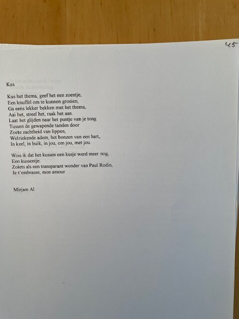 pomgedichten.nl heeft het exclusieve recht gekregen om 65 teksten van Miriam Al tweewekelijks op de woensdag te publiceren – dat gaan we doen! de teksten zijn door haar helaas overleden vriend Merik van der Torren nog net voor zijn dood uitgetypt en van een nummer voorzien én in een blauw mapje gedaan. vandaag tekst nummer 45 (Merik deed 2x 45, ok!) – dank je wel Merik – dank je wel Mirjam Al.