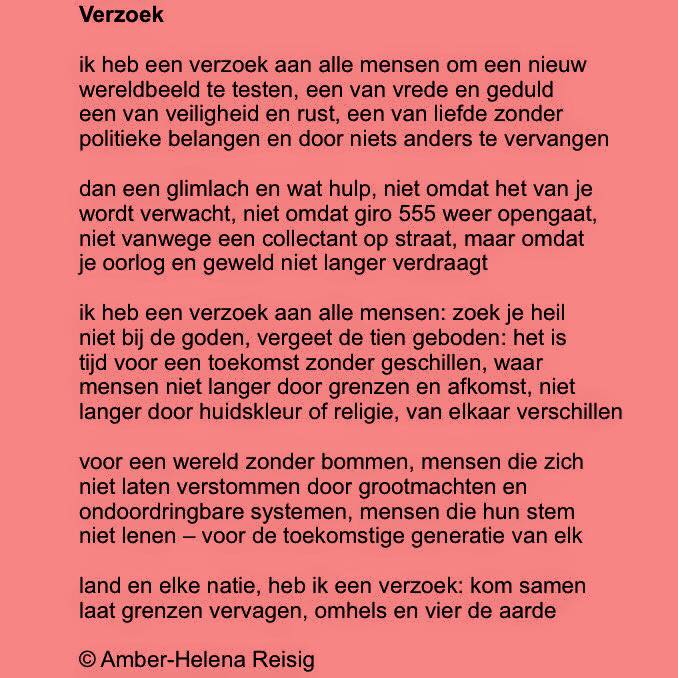 Amber Helena Reisig, Martin Beversluis, Martin Aart de jong, Bjorn van Rozen, Mike Platenkamp en Pom Wolff verenigden zich een aantal jaren geleden onder de naam HONGERLIEF – we traden een paar jaar her en der in het land op, we hadden mooie uren. ik was vaker deelgenoot van dichtersgroepen – zo was er ooit de legendarische DE RESIDENTIE – als je dat binnenkreeg dan was het festival wel geslaagd. HONGERLIEF – geheel in de tijdgeest van toen – was liever. Amber Helena wil ambtenaar van het jaar worden – ik vond van haar een gedicht over de wereld uit 2015 – en zie en lees hoe aktueel!