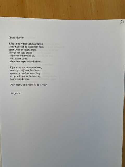 pomgedichten.nl heeft het exclusieve recht gekregen om 65 teksten van Miriam Al tweewekelijks op de woensdag te publiceren – dat gaan we doen! de teksten zijn door haar helaas overleden vriend Merik van der Torren nog net voor zijn dood uitgetypt en van een nummer voorzien én in een blauw mapje gedaan. vandaag tekst nummer 51 – dank je wel Merik – dank je wel Mirjam Al.