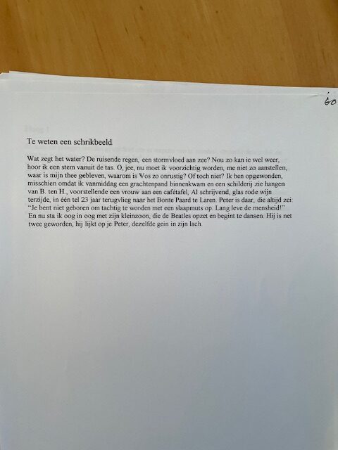 pomgedichten.nl heeft het exclusieve recht gekregen om 65 teksten van Miriam Al tweewekelijks op de woensdag te publiceren – dat gaan we doen! de teksten zijn door haar helaas overleden vriend Merik van der Torren nog net voor zijn dood uitgetypt en van een nummer voorzien én in een blauw mapje gedaan. vandaag tekst nummer 60 – dank je wel Merik – dank je wel Mirjam Al.