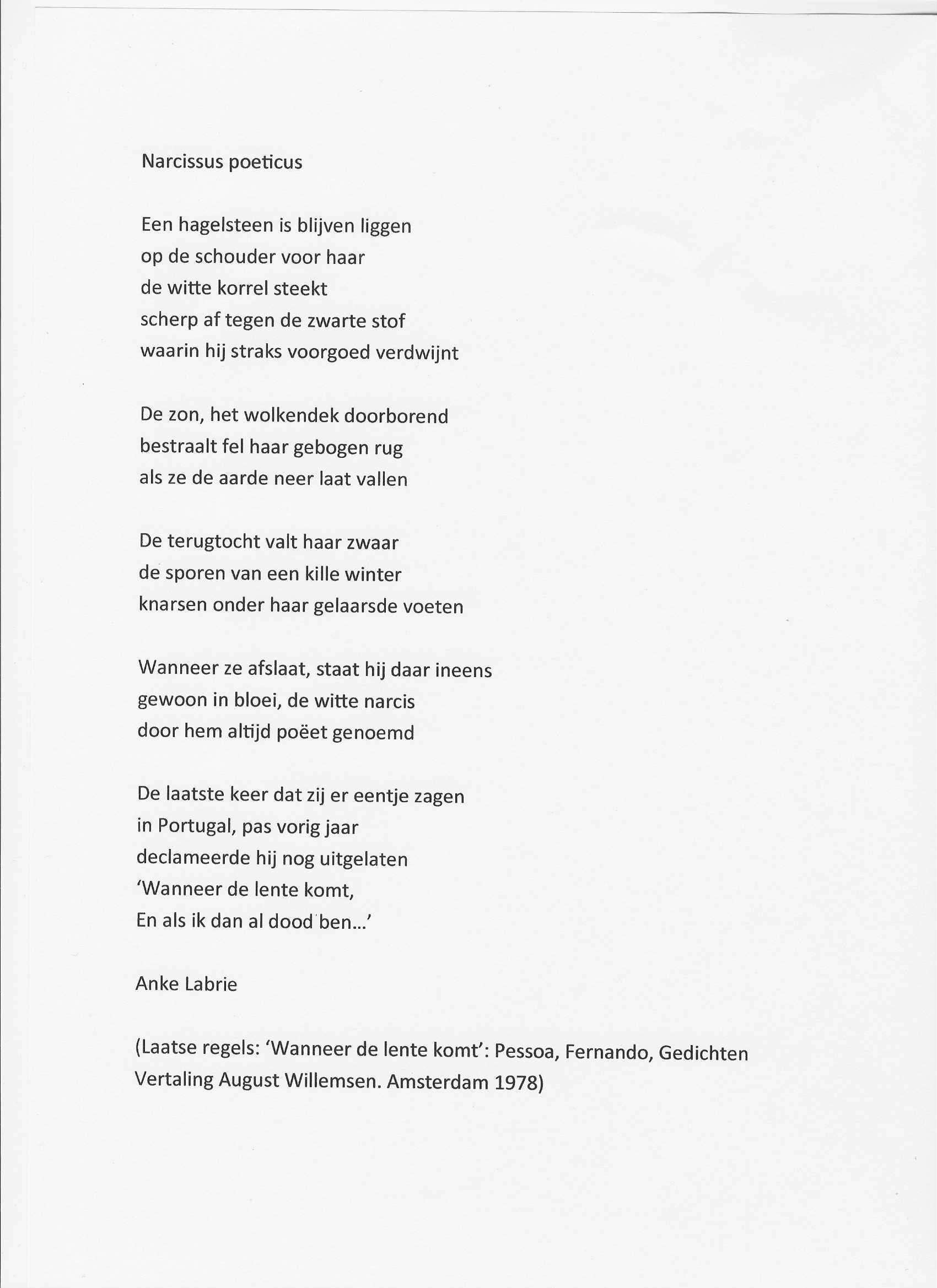 dank aan Anke Labrie voor de – op de valreep ingestuurde ‘Pessoa’ bijdrage aan deze site – na de ochtendwandeling ontvangen – het jury rapport was al geschreven – net als hierboven de bijdrage van Peter Knipmeijer wordt Ankes poëtische bijdrage zeer gewaardeerd. zeer toepasselijk trouwens de beschrijving van een wandeling in de lente.