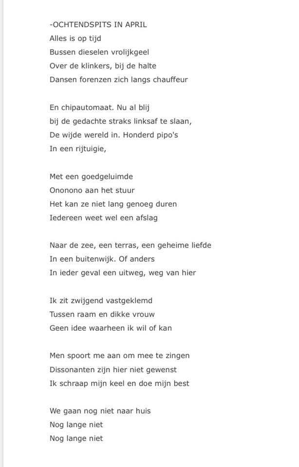 dichter wijst ons op de langzame gang die we hebben te gaan richting lente – de elementen zorgvuldig in de strofen verwerkt. het zware kan langzaam maar zeker plaatsmaken voor het lichtere lentegevoel. eerst nog effe sneeuwlaarzen aan. als we rob mogen geloven.